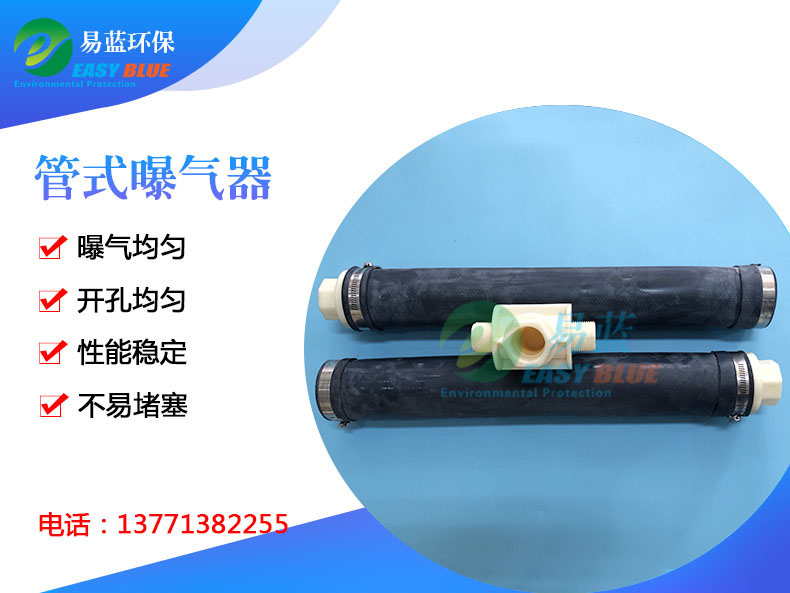 曝氣膜片、支撐管、空氣管道。管式曝氣器外徑69mm,常規(guī)為580mm、800mm和1000mm。長度在580mm一下采用擠出或模壓成型,長度大于580mm采用擠出成型。膜管上一1.5mm大小、2×2.5mm的間距打孔,能產(chǎn)生直徑1-3mm的均勻微小氣泡膜管頂部有15mm長無氣孔區(qū),當終斷供氣時膜片立即恢復(fù)原狀。對空氣入口起自動防逆流作用。