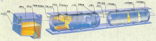 (5)污泥池:初沉池、二沉池的所有污泥均用空氣提至 WSZ-A的污泥池內(nèi)進行好氧消化。污泥池的清液回流至接觸氧化池內(nèi)進行再處理。消化后剩余污泥很少,一般1-2年清理一次。清理方法可采用吸糞車從污泥池的檢查孔伸入污泥底部,進行抽吸外運即可。(WSZ-A 0.5-5T/h,污泥采用厭氧消化)